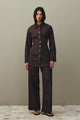Denim woven fabric shirt with collar, long sleeves, dart details, and decorative pockets